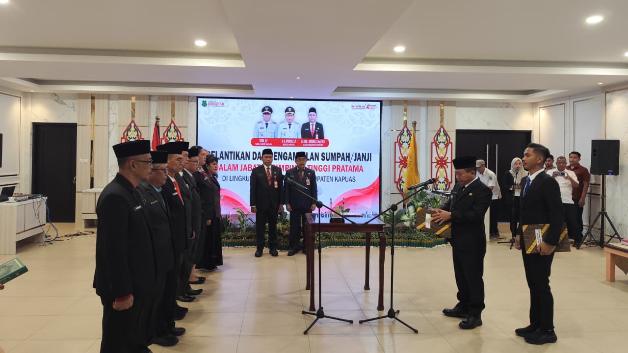 Kuala Kapuas, infokalteng.co.id – Pemerintah Daerah Kabupaten Kapuas Gelar Pelantikan dan Pengambilan sumpah/janji Jabatan Pimpinan Tinggi Pratama di daerah setempat, Senin (25/8/2025) pagi.