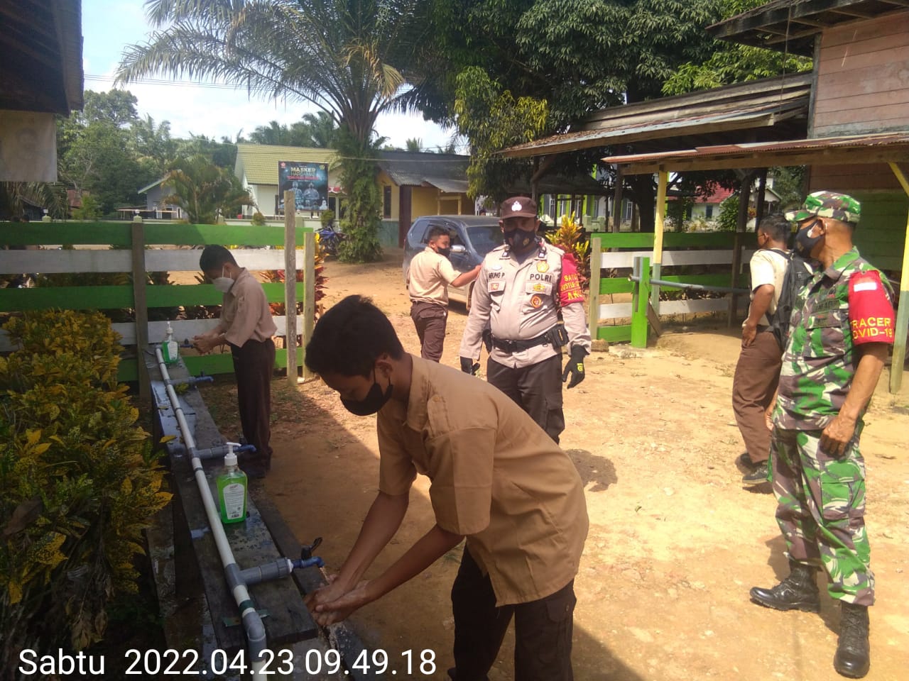 Pangkalan Bun, infokalteng.co.id – Jajaran Polda Kalteng, Aiptu Agung P ajak guru dan siswa untuk taati prokes dengan salah satu cara untuk rajin mencuci tangan menggunakan sabun dan air mengalir. Kel. Pangkut, Kec. Arut Utara, Kab. Kotawaringin Barat Prov. Kalimantan Tengah, Sabtu (23/04/2022) pagi.