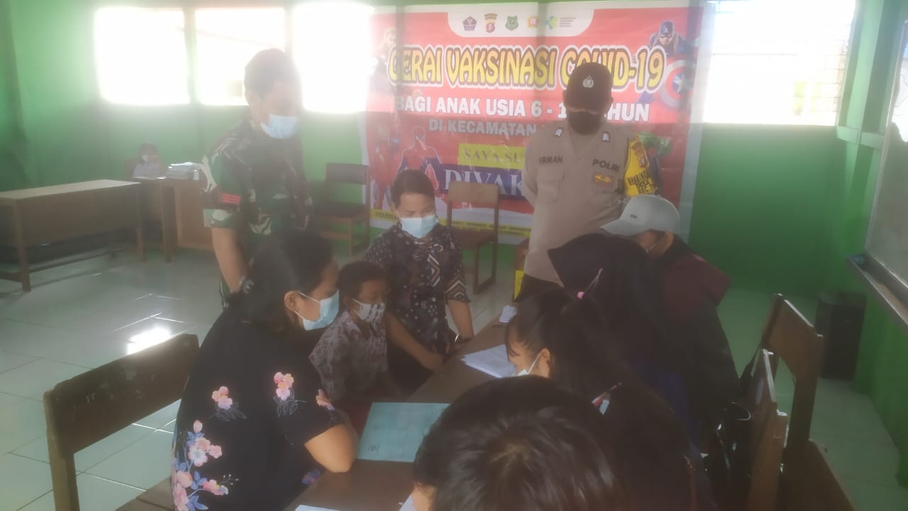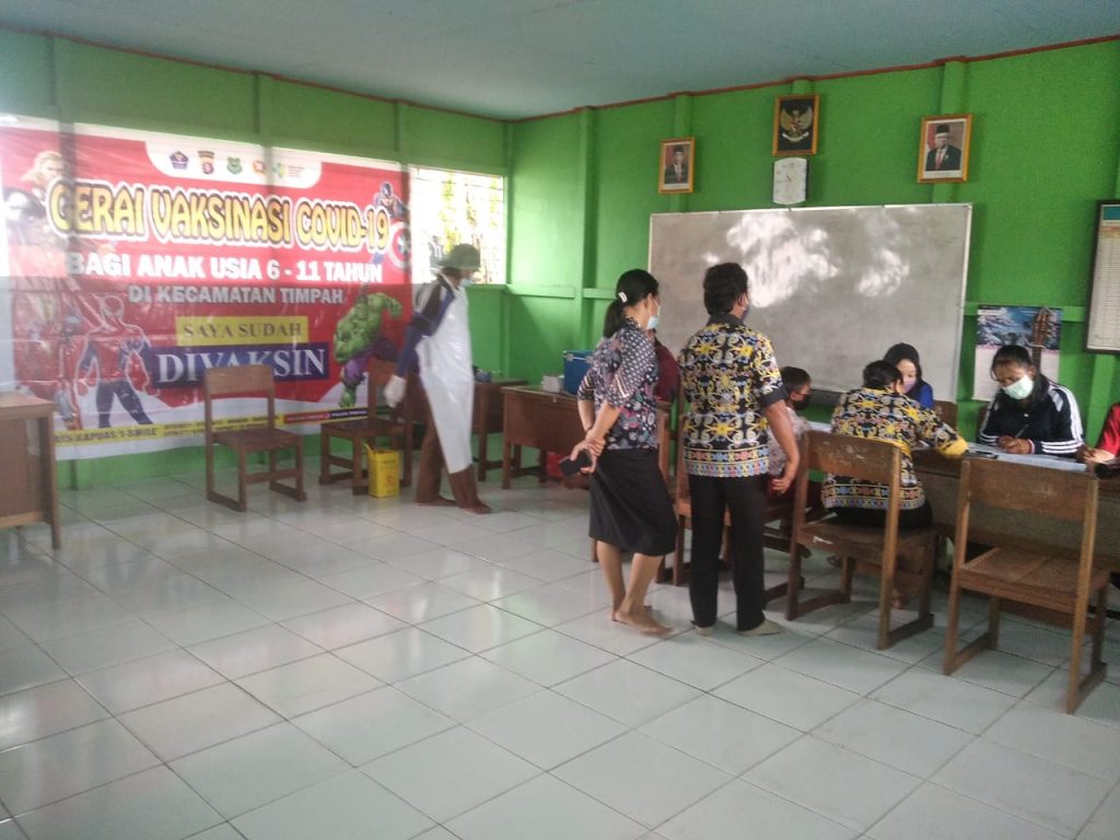 “Pagi ini anggota melakukan pengamanan pelaksanaan vaksinasi Covid-19 sebagaimana upaya percepatan vaksinasi yang di berikan kepada para siswa Sekolah Dasar yang sudah berusia 6 – 11 tahun,” ucap Kapolsek Timpah Ipda Fadlullah Azmy, S.H.