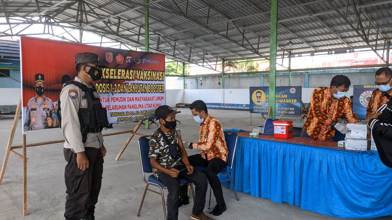 Pangkalan Bun, infokalteng.co.id – Polda Kalimantan Tengah (Kalteng). Personil Posyan KP3 Kumai Polsek Kumai lakukan pengamanan kegiatan Vaksin Covid-19 Dosis Ke 1 (Satu), Ke 2 (Dua) dan Booster PKM Kumai, di Terminal Penumpang Pelabuan Panglima Utar, Kamis (21/4/2022) pagi.
