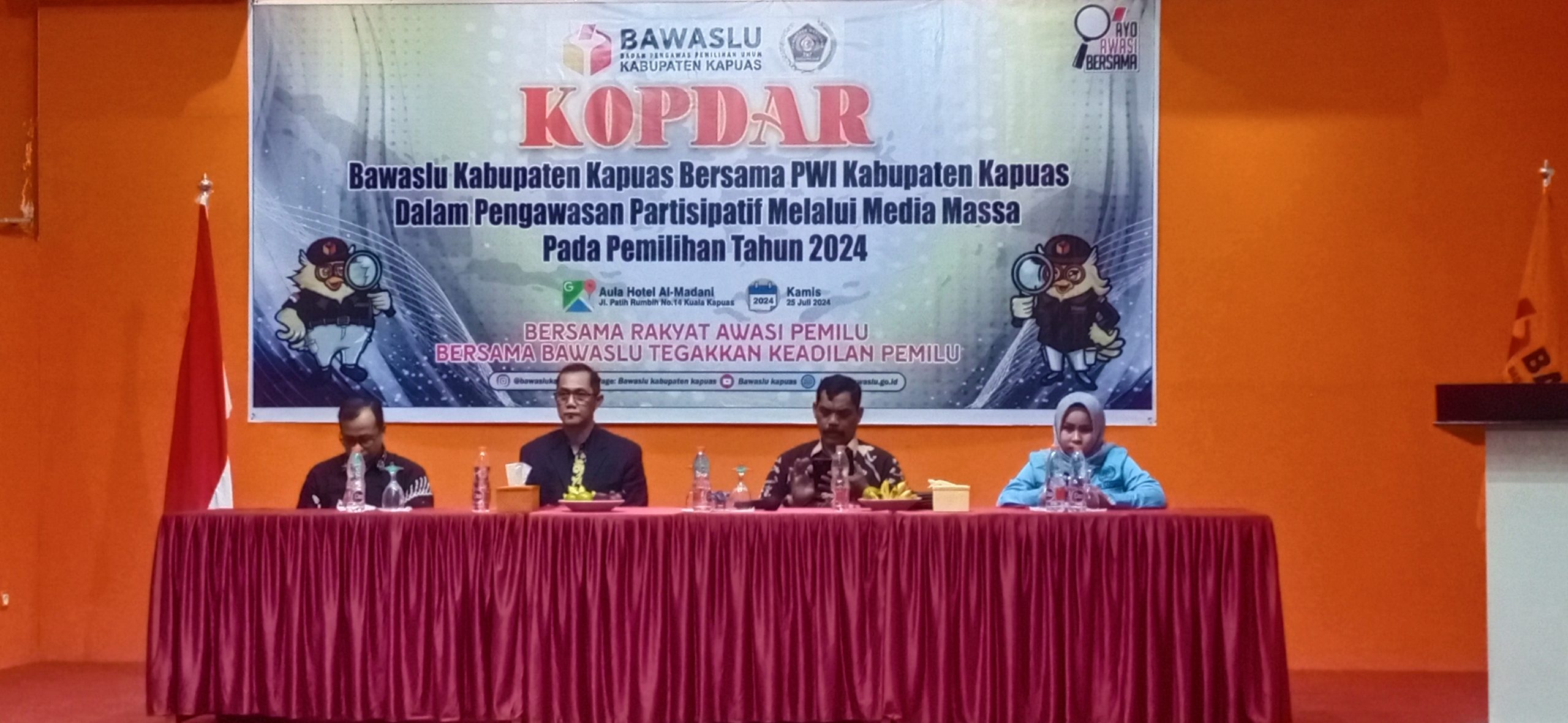 Kuala Kapuas, infokalteng.co.id – Badan Pengawas Pemilihan Umum (Bawaslu) Kabupaten Kapuas bekerjasama dengan Persatuan Wartawan Indonesia (PWI) menggelar Kopi Darat (Kopdar) terkait pengawasan partisipatif melalui media massa pada pemilihan tahun 2024.