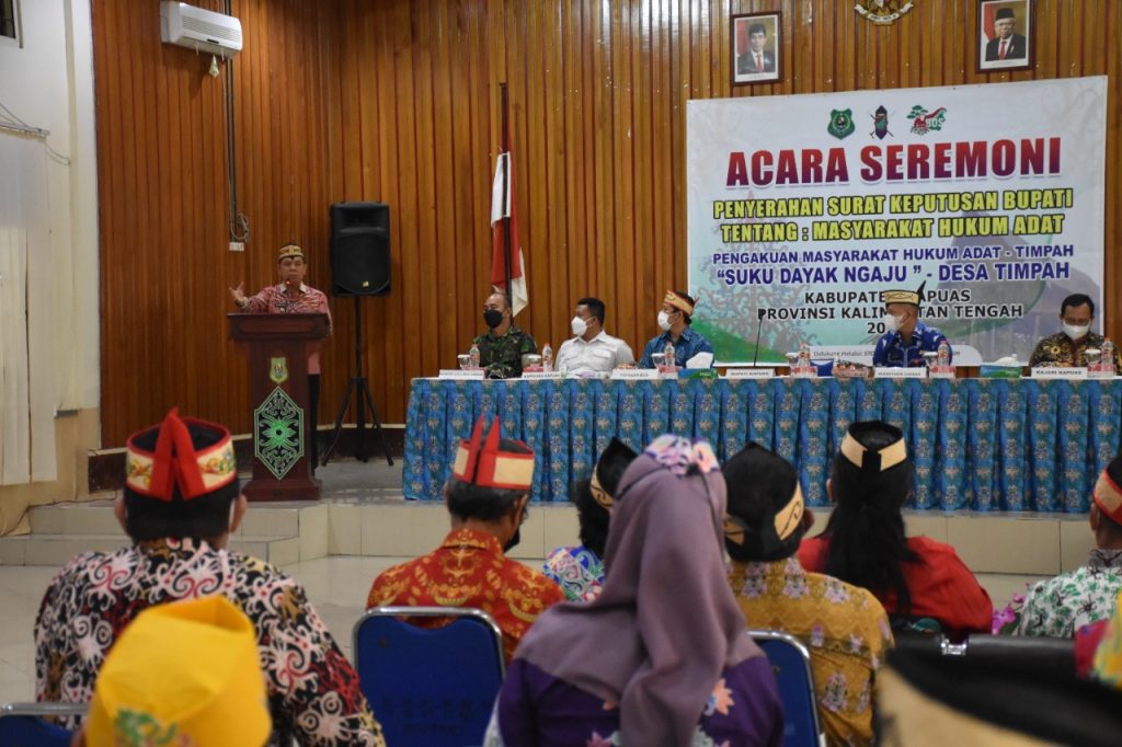 Kuala Kapuas, infokalteng.co.id – Bupati Kapuas Ben Brahim S Bahat menyerahkan secara langsung Surat Keputusan (SK) Tentang Pengakuan dan Perlindungan Masyarakat Hukum Adat (MHA) Timpah “Suku Dayak Ngaju” Desa Timpah, Kecamatan Timpah, Kabupaten Kapuas, Kamis (20/1).