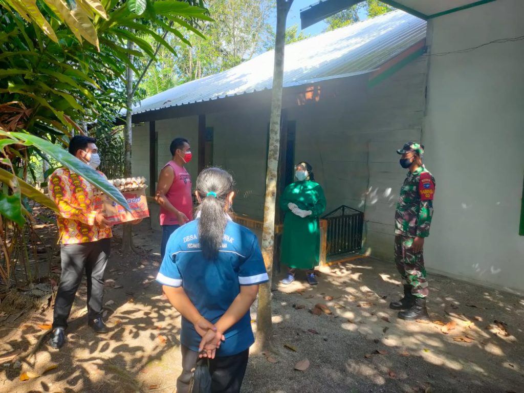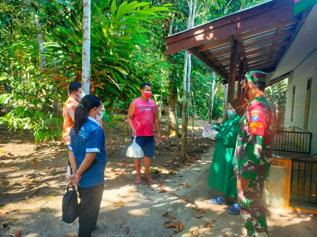 Pangkalan Bun, infokalteng.co.id – Babinsa Dawak Sertu Imam Syafi’i, Koramil 1014 – 03/Kotawaringin Lama bersama dengan Aparat Desa Dawak menyalurkan bantuan bahan pokok (sembako) untuk pasien Covid-19 yang tengah menjalani isolasi mandiri di rumah.