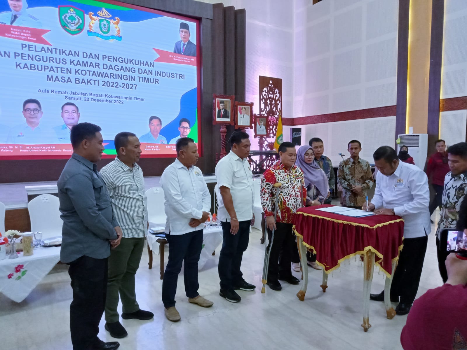 Sampit, infokalteng.co.id – Dandim 1015/Spt Letkol Inf Abdul Hamid, menghadiri pelantikan Ketua Kepala Kamar Dagang dan Industri (KADIN) Kabupaten Kotim, periode 2022 – 2027 yang bertempat di Aula Rumah Jabatan Bupati Kotim Jln. A. Yani Kec. MB. Ketapang Kab. Kotawaringin Timur, Prov. Kalimantan Tengah, Kamis malam (22/12).
