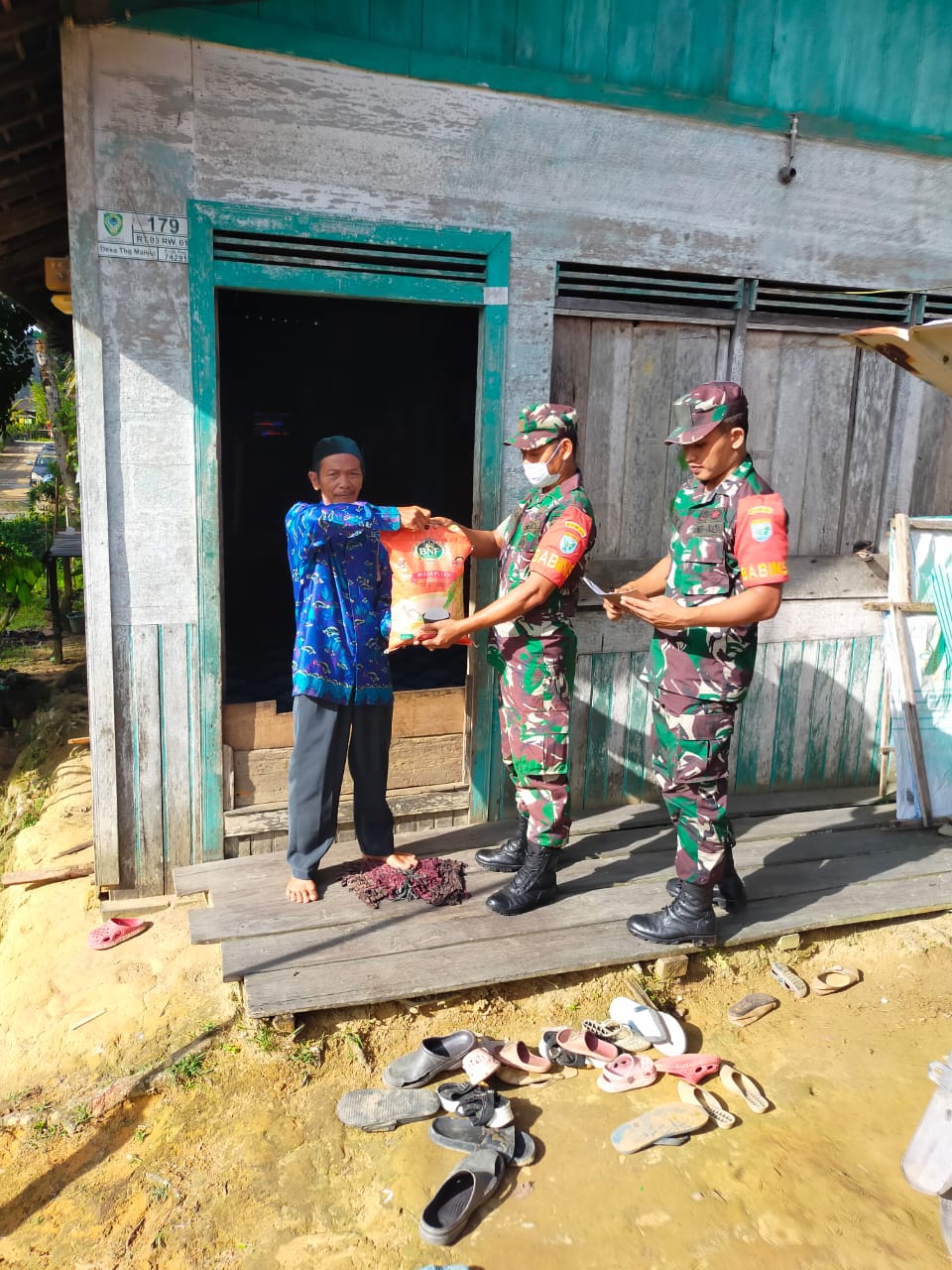 Seruyan, infokalteng.co.id – Danramil 1015-13/Seruyan Hulu Kapten Inf Syahidin bersam anggota memberikan bantuan Sembako berupa Beras kepada masyarakat yang terkena dampak atau imbas dari banjir akibat tingginya intensitas hujan di desa Tumbang Manjul, Kamis (22/12).