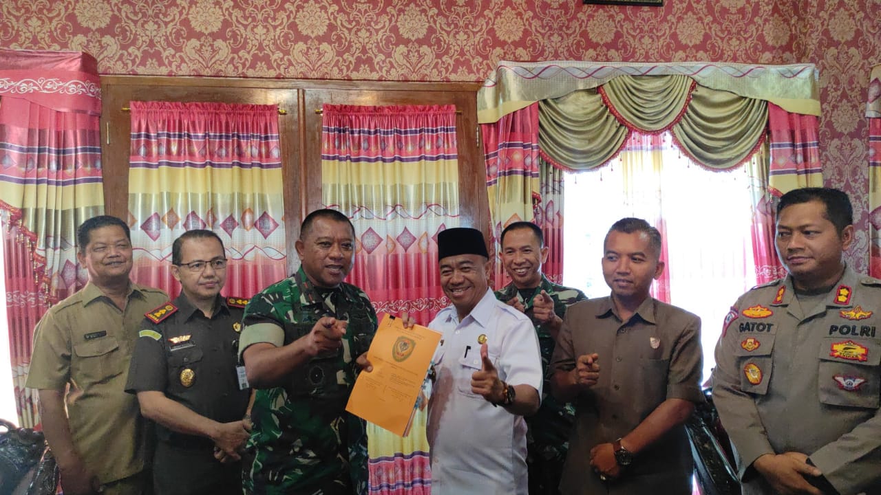 Seruyan, infokalteng.co.id – Danrem 102/Panju Panjung Brigjen TNI Yudianto Putrajaya didampingi Komandan Kodim 1105/Spt Letkol Inf Abdul Hamid melaksanakan silaturahmi dan penerimaan tanah hibah dari Pemda Seruyan seluas 3,8 Hektar serta penandatangan askah kerjasama program Karya Bakti TA.2022 di rumah Jabatan Bupati Kab Seruya, Senin (10/10).