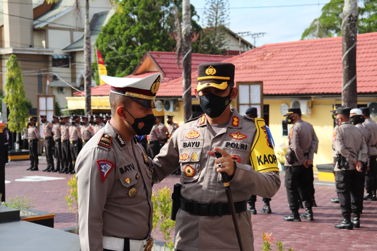 Pangkalan Bun, infokalteng.co.id – Kapolres Kotawaringin Barat AKBP Bayu Wicaksono memberikan arahan kepada Kasatlantas Polres Kobar usai apel pagi di halaman Mapolres Kobar, Senin (13/6/2022) pagi.