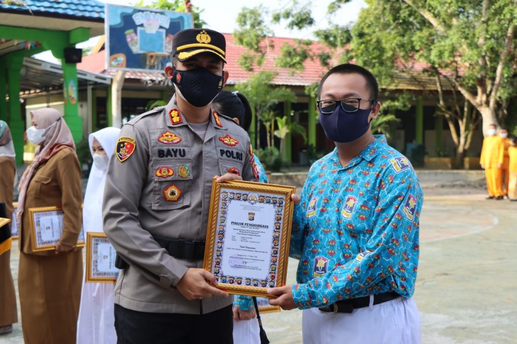 Pangkalan Bun, infokalteng.co.id – Kapolres Kotawaringin Barat AKBP Bayu Wicaksono, S.H,. S.I.K., M.Si. di dampingi Kabag SDM Polres Kotawaringin Barat Kompol Hendry, S.E., dan Kasatbinmas Polres Kobar Iptu Dwi Gatot Asmoro berkunjung ke SMA N 1 Arsel untuk melaksanakan Upacara pemberian penghargaan terhadap Guru dan Siswa yang berprestasi. Sekaligus memberikan himbauan kamtibmas dan protokol kesehatan untuk selalu diterapkan di lingkungan sekolah.