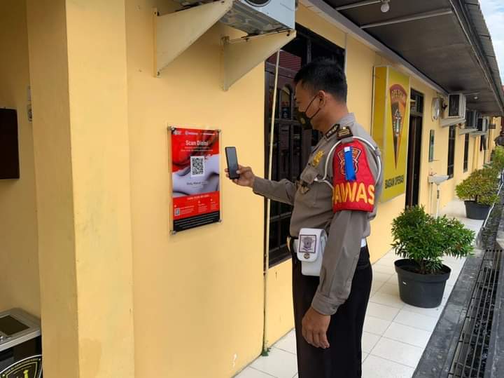 Sebelum masuk Polres Kobar, setiap orang diwajibkan memindai QR code yang telah tersedia. Hal ini lantaran aplikasi PeduliLindungi dapat membantu meningkatkan partisipasi masyarakat dalam melaporkan lokasi dan riwayat perjalanan.