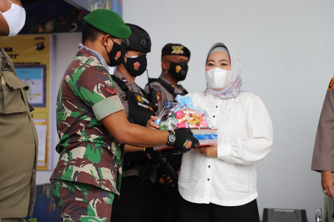 Pada kesempatan itu Bupati Kobar memberikan bingkisan parcel kepada beberapa personil yang sedang berjaga di Pos Pam.