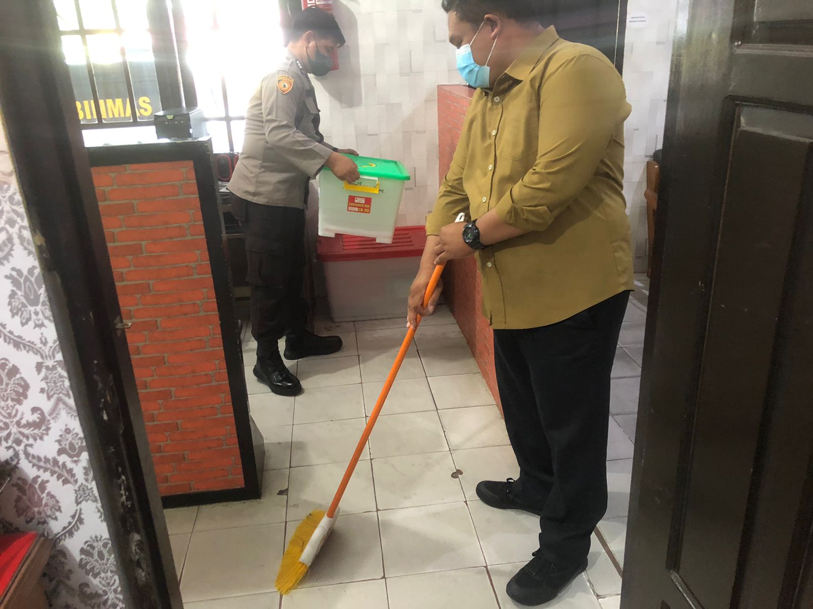Terlihat para Anggota Satintelkam bersama – sama membersihkan, mengepel dan memungut membersihkan sampah – sampah yang ada disekitar lingkungan Satintelkam.