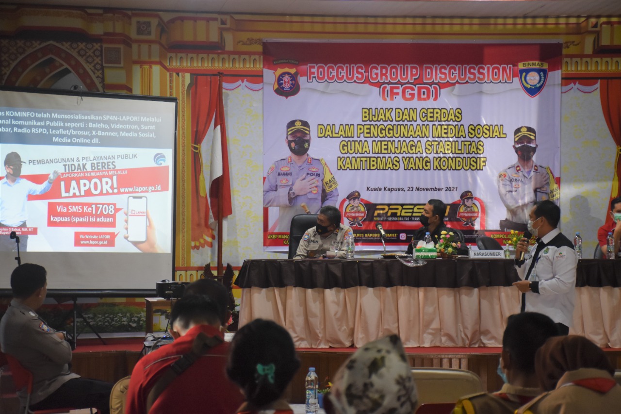 Kuala Kapuas, infokalteng.co.id – Satbinmas Polres Kapuas menggelar Focus Group Discussion (FGD) bertemakan bijak dan cerdas dalam penggunaan Media Sosial (medsos) guna menjaga stabilitas Keamanan dan Ketertiban Masyarakat (Kamtibmas) yang kondusif, kegiatan tersebut berlangsung di Aula Dinas Pendidikan Kabupaten Kapuas, Selasa (23/11).
