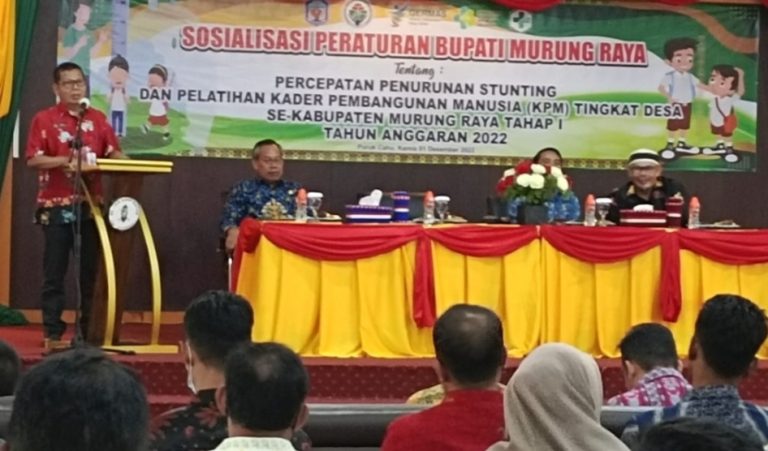 Puruk Cahu, infokalteng.co.id – Bupati Murung Raya Perdie M Yoseph melalui.Kepala Dinas Pemberdayaan Masyarakat dan Desa (DPMD) Donald, secara resmi membuka kegiatan sosialisasi peraturan bupati tentang percepatan penurunan stunting dan pelatihan kader pembangunan manusia (KPM) tingkat Desa se Kabupaten Murung Raya tahap I tahun anggaran 2022, yang dilaksanakan di kantor dewan adat dayak (DAD), Kamis (1/12).