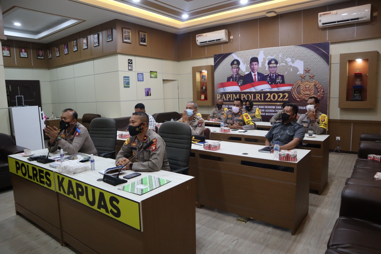 Kuala Kapuas, infokalteng.co.id – Bertempat di Aula Sarja Arya Racana Polres Kapuas telah dilaksanakan kegiatan Vicon Rapim Polri 2022 yang diikuti Kapolres Kapuas AKBP Qori Wicaksono, S.I.K., Wakapolres Kapuas Kompol I Kadek Dwi Yoga Sidhimantra, W., S.H., S.I.K., Pju Polres Kapuas serta Kapolsek Jajaran Polres Kapuas, Rabu (2/3) pukul 08.00 WIB.