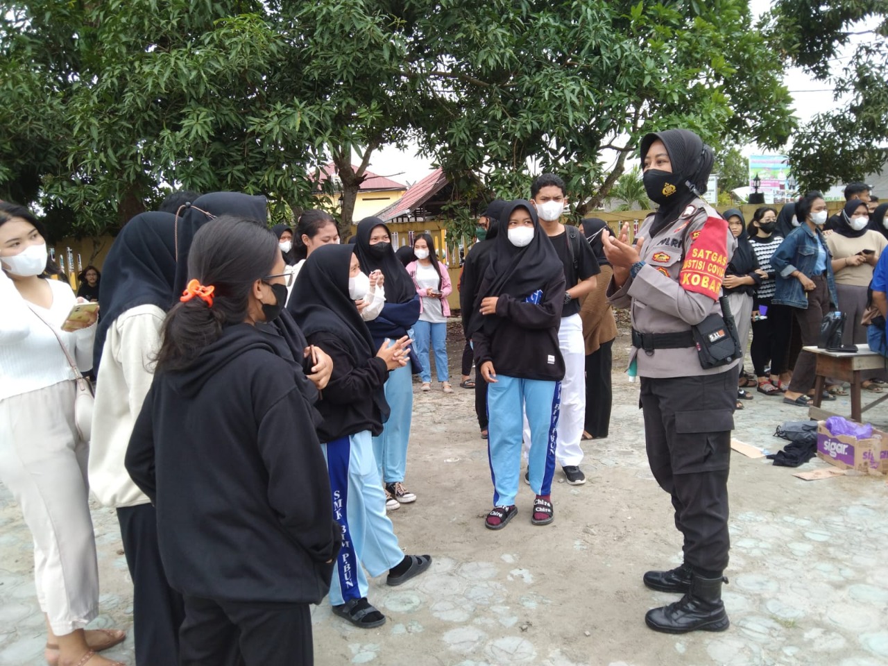 Kapolres Kobar AKBP Devy Firmansyah, S.I.K., melalui Kasatbinmas AKP Sayem Sunarto dan anggota Bripka Nurjanah menghimbau dan mengajak masyarakat, pelajar peserta turnamen bola volianak – anak siswa siswi untuk selalu menerapkan protkes yaitu 5 M memakai masker, mencuci tangan pakai sabun, menjaga jarak dan menjauhi kerumunan serta mengurangi mobilitas jangan menambah klaster baru covid – 19 serta mengajak masyarakat dan pelajar yang belum vaksin untuk vaksin di Gerai vaksin Presisi Polres Kobar.