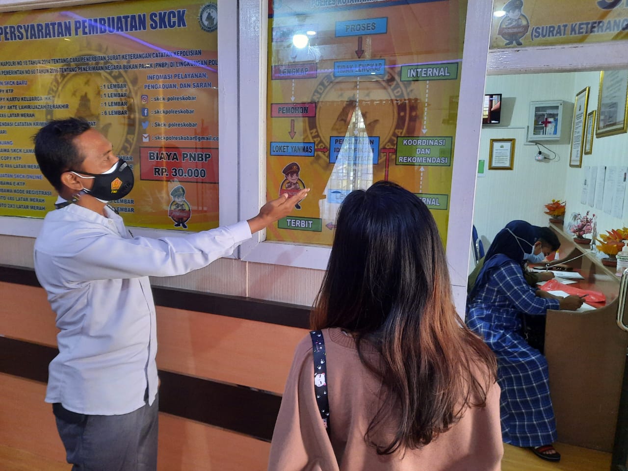 Kapolres Kobar AKBP Bayu Wicaksono, S.H., S.I.K., M.Si melalui Kasat Intelkam Polres Kobar AKP NURTATA S.A.P menuturkan bahwa,”Pagi ini salah satu anggota Satintelkam Polres Kobar yang bertugas di Pelayanan SKCK telah memberikan sosialisasi kepada masyarakat yang membuat SKCK mengenai mekanisme dan prosedur dalam pembuatan SKCK, hal ini dilakukan agar masyarakat paham dan mengerti mekanisme pembuatan SKCK,”Ujar Kasat Intelkam Polres Kobar, AKP Nurtata.