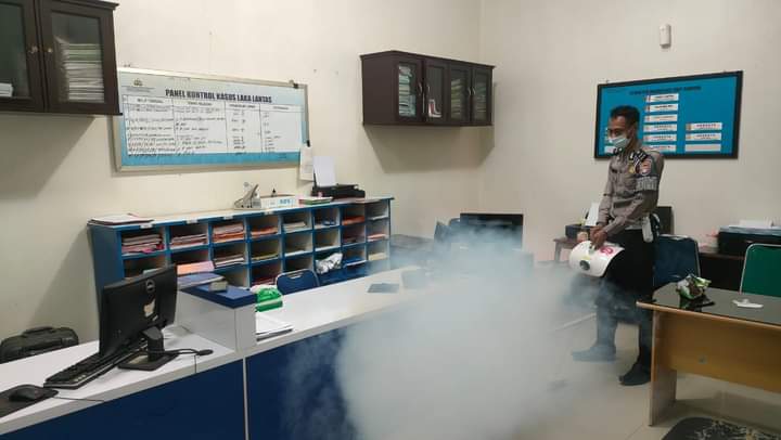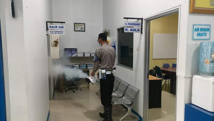 Pangkalan Bun, infokalteng.co.id – Guna mencegah penyebaran Virus Covid-19, Satlantas Polres Kotawaringin Barat (Kobar) jajaran Polda Kalteng melaksanakan Fogging disinfektan di setiap ruangan Kantor Satlantas, Sabtu (16/04/2022) pagi.