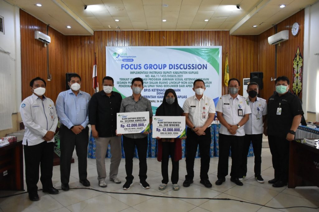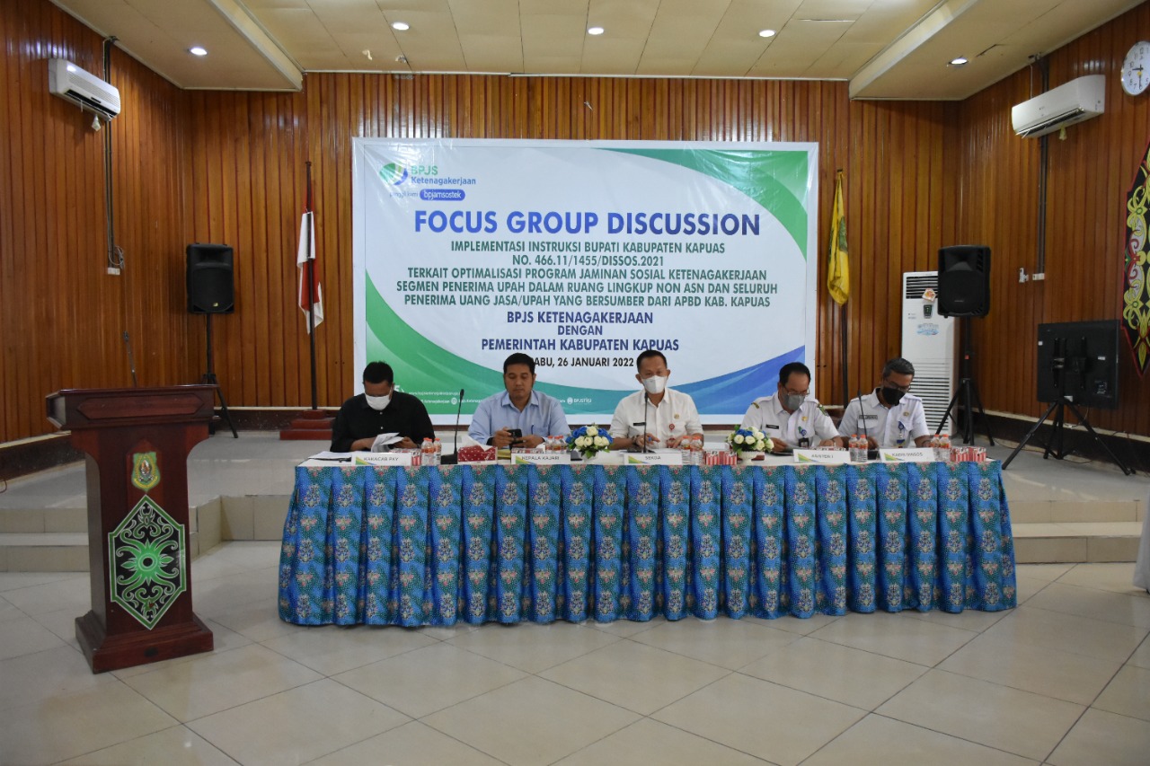 Kuala Kapuas, infokalteng.co.id – Pemerintah Kabupaten Kapuas bersama dengan Badan Penyelenggara Jaminan Sosial (BPJS) Ketenagakerjaan melaksanakan Focus Group Discussion (FGD) perihal implementasi Instruksi Bupati Kapuas No.466.11/1455/DISSOS.2021 terkait optimalisasi Program Jaminan Sosial Ketenagakerjaan segmen Penerima Upah dalam ruang lingkup Non Aparatur Sipil Negara (ASN) dan seluruh penerima uang jasa/upah yang bersumber dari APBD Kabupaten Kapuas, bertempat di Aula Bappeda Kapuas, Rabu (26/1).