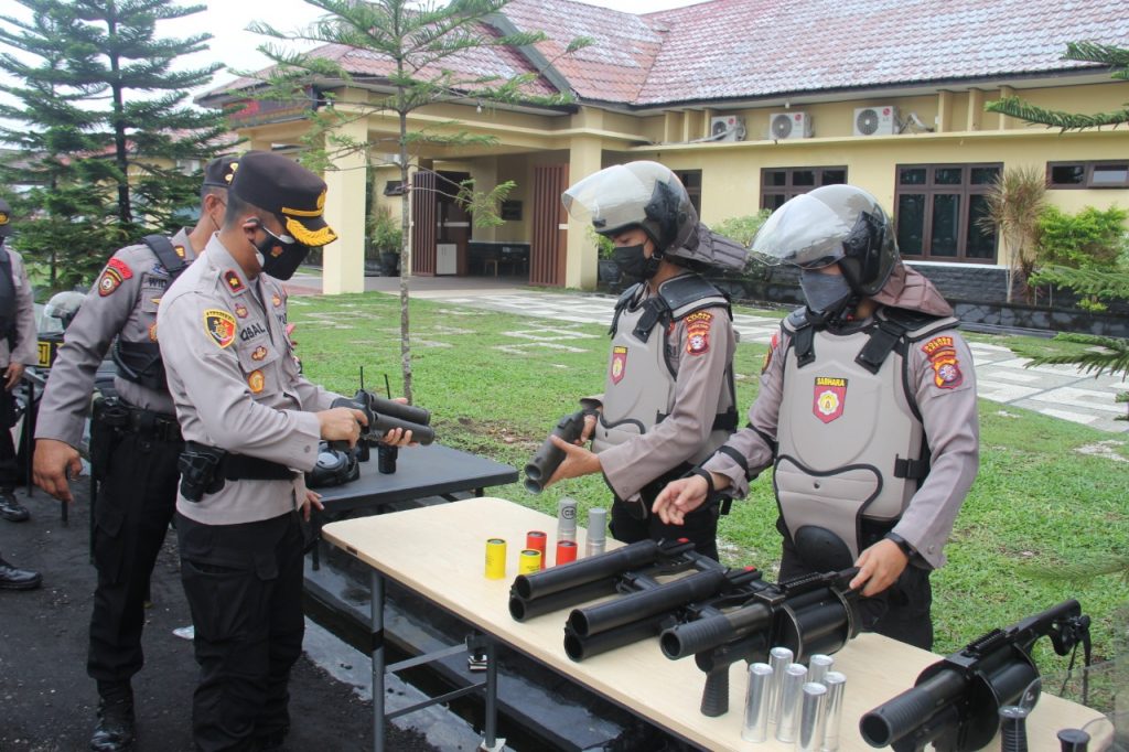 Usai apel siaga, sarana dan prasarana pendukung seperti peralatan Dalmas, senjata api laras panjang, kendaraan taktis AWC serta mobil patroli turut digelar untuk mengetahui kondisinya.