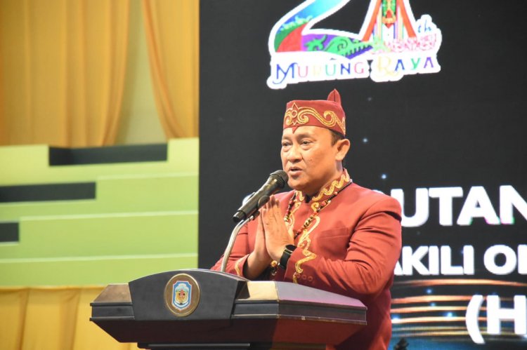 Bupati Mura Perdie M. Yoseph menyampaikan perayaan syukur HUT ke-21 Murung Raya bertema “Kreatif dan Inovatif Membangun Literasi Masyarakat Yang Berdaya Saing Menuju Murung Raya Emas 2030″.
